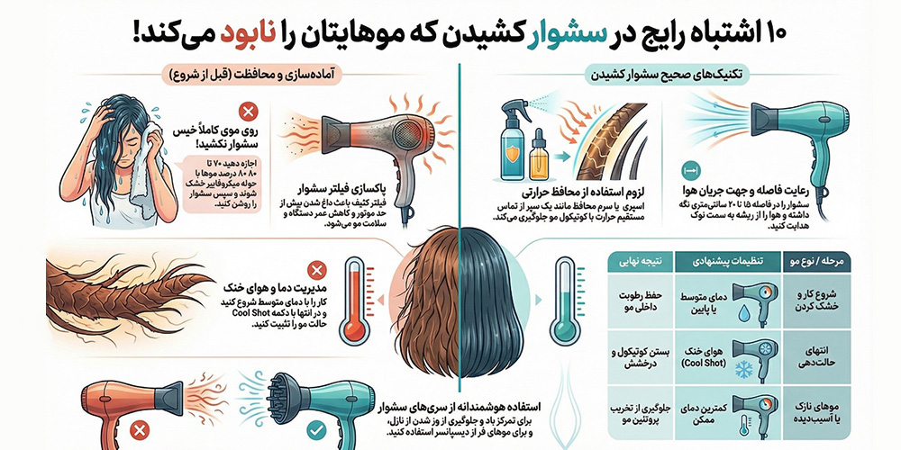 در این مقاله از مدیاژ، ۱۰ اشتباه رایج و مخرب در سشوار کشیدن مو را بررسی میکنیم؛ اشتباهاتی که بسیاری از ما ناخواسته مرتکب میشویم. با شناخت این موارد و جایگزین کردن راهکارهای درست، میتوانید موهایی سالمتر، درخشانتر و مقاومتر داشته باشید و بدون نگرانی از آسیب حرارتی، از زیبایی طبیعی موهای خود لذت ببرید.