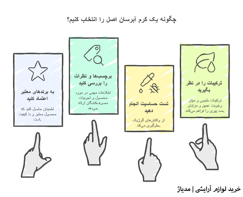 برای اطمینان از اصل بودن کرم آبرسان، همیشه به برندهای معتبر و شناخته شده اعتماد کنید و از خرید محصولات غیرمجاز خودداری کنید. بررسی برچسبها، تاریخ انقضاء و همچنین نظرات مصرفکنندگان میتواند در انتخاب صحیح به شما کمک کند. همچنین، در صورتی که از کرم آبرسان جدیدی استفاده میکنید، ابتدا یک تست حساسیت روی ناحیه کوچکی از پوست انجام دهید تا از بروز هرگونه واکنش آلرژیک جلوگیری کنید.